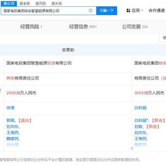 天眼查App显示,近日,国家电投集团智慧能源投资有限公司发生工商变更,企业名称变更为国家电投集团综合智慧能源有限公司,国家电投集团绿能科技发展有限公司退出股东行列,同时注册资本由20亿人民币增至约30亿人民币。